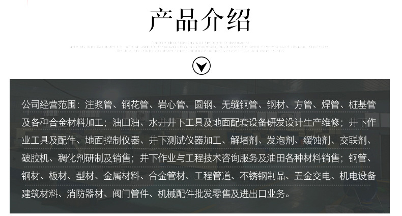 公司經營范圍:注漿管、鋼花管、巖心管、圓鋼、無縫鋼管、鋼材、方管、焊管、樁基管及合金材料加工;油田油、水井井下工具及地面配套設備研發設計生產維修;井下作業工具及配件、地面控制儀器、井下測試儀器加工、解堵劑、發泡劑、緩蝕劑、交聯劑、破膠機、稠化劑研制及銷售;井下作業與工程技術咨詢服務及油田材料銷售;鋼管、鋼材、板材、型材、金屬材料、合金管材、工程管道、不銹鋼制品、五金交電、機電設備、建筑材料、消防器材、閥門管件、機械配件批發零售及進出口業務。