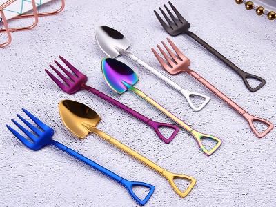 創意不銹鋼304軍工小土鏟勺小叉子彩色鍍金餐具咖啡勺精致雪糕勺