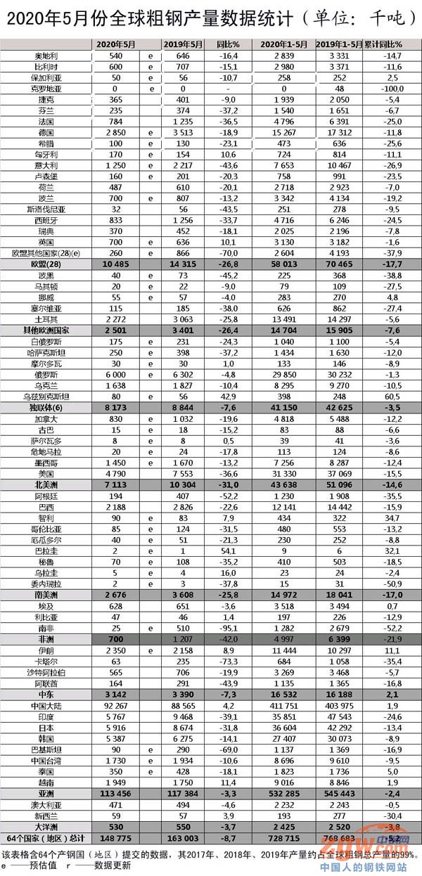 5月份,亞洲粗鋼產(chǎn)量為1.13億噸,同比下降3.3%;歐盟粗鋼產(chǎn)量為1048萬(wàn)噸,同比下降26.8%;北美洲粗鋼產(chǎn)量為711萬(wàn)噸,同比下降31.0%;南美洲粗鋼產(chǎn)量為268萬(wàn)噸,同比下降25.8%;中東地區(qū)粗鋼產(chǎn)量為314萬(wàn)噸,同比下降7.3%;獨(dú)聯(lián)體的粗鋼產(chǎn)量為817萬(wàn)噸,同比下降7.6%。