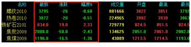 期貨震蕩收跌,期螺跌26收報3795,期卷跌20收報3872,鐵礦石移倉換月,主力01合約今日上漲19收報834,焦炭跌50收報2008,焦煤跌16.5收報1196。